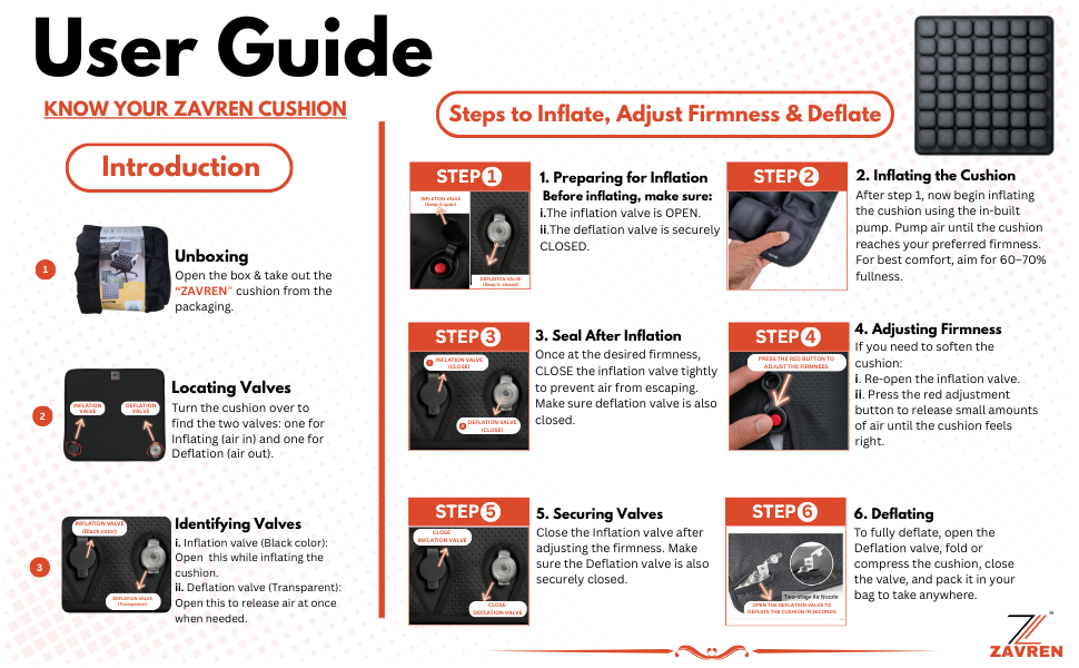 The Zavren air bubble seat cushion is a 36‑cell inflatable seat cushion designed for all‑day comfort. This air bubble seat cushion features a built‑in pump for easy inflation and adjustable support on office chairs, car seats, and travel. For information on ergonomic sitting positions, visit Blog.