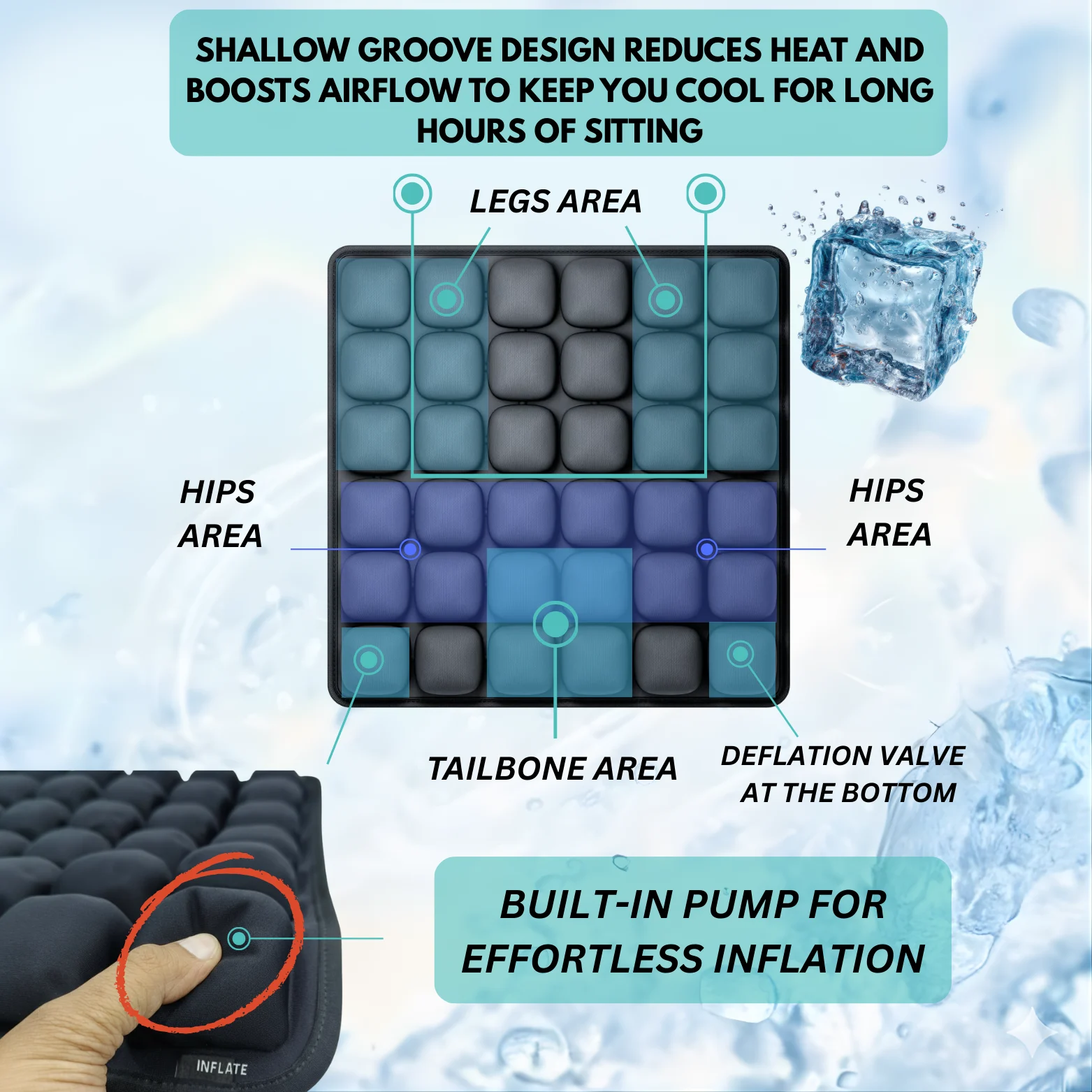- Enhanced 360° Airflow & Cooling Strategic airflow channels between each bubble keep you cool and dry. Say goodbye to trapped heat and sweaty backs common with solid cushions.