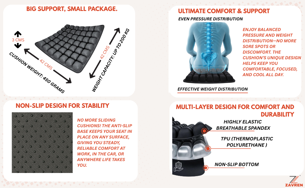 The Zavren air bubble seat cushion is a 36‑cell inflatable seat cushion designed for all‑day comfort. This air bubble seat cushion features a built‑in pump for easy inflation and adjustable support on office chairs, car seats, and travel. For information on ergonomic sitting positions, visit  Blog.