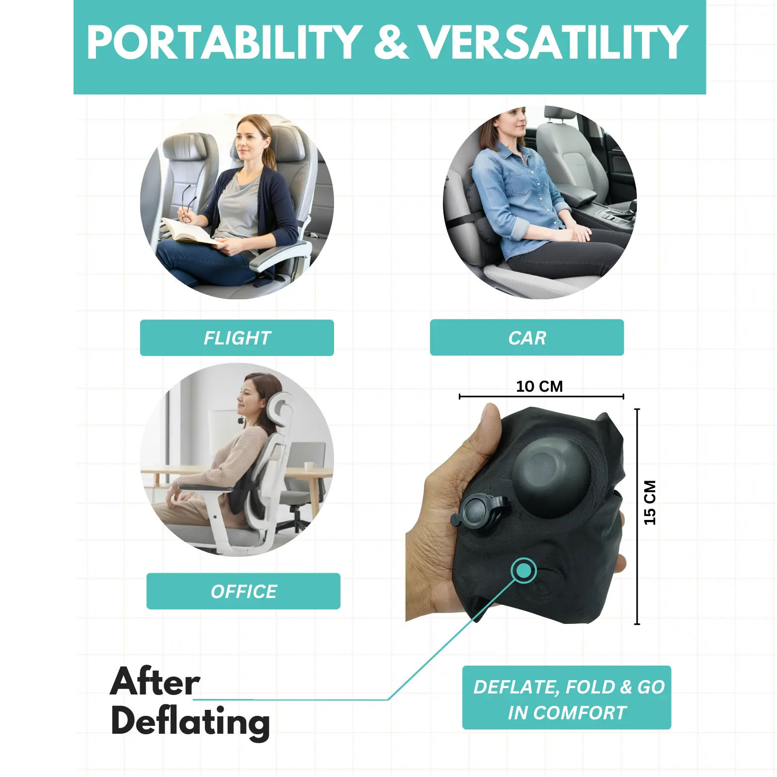 Our collection stands out for its modern design and attention to health. From expertly crafted inflatable neck pillows that cradle your head and prevent strain, to pressure-distributing seat cushions and targeted lumbar support pillows-every product is tested for quality and performance. We focus on combining elegance, functionality, and long-lasting comfort. Years of refinement ensure that our accessories deliver reliability, safety, and a pleasant appearance, so you can trust them for regular use whether at home, office, or on the go. Experience the difference that thoughtful, ergonomic design brings to your daily life
