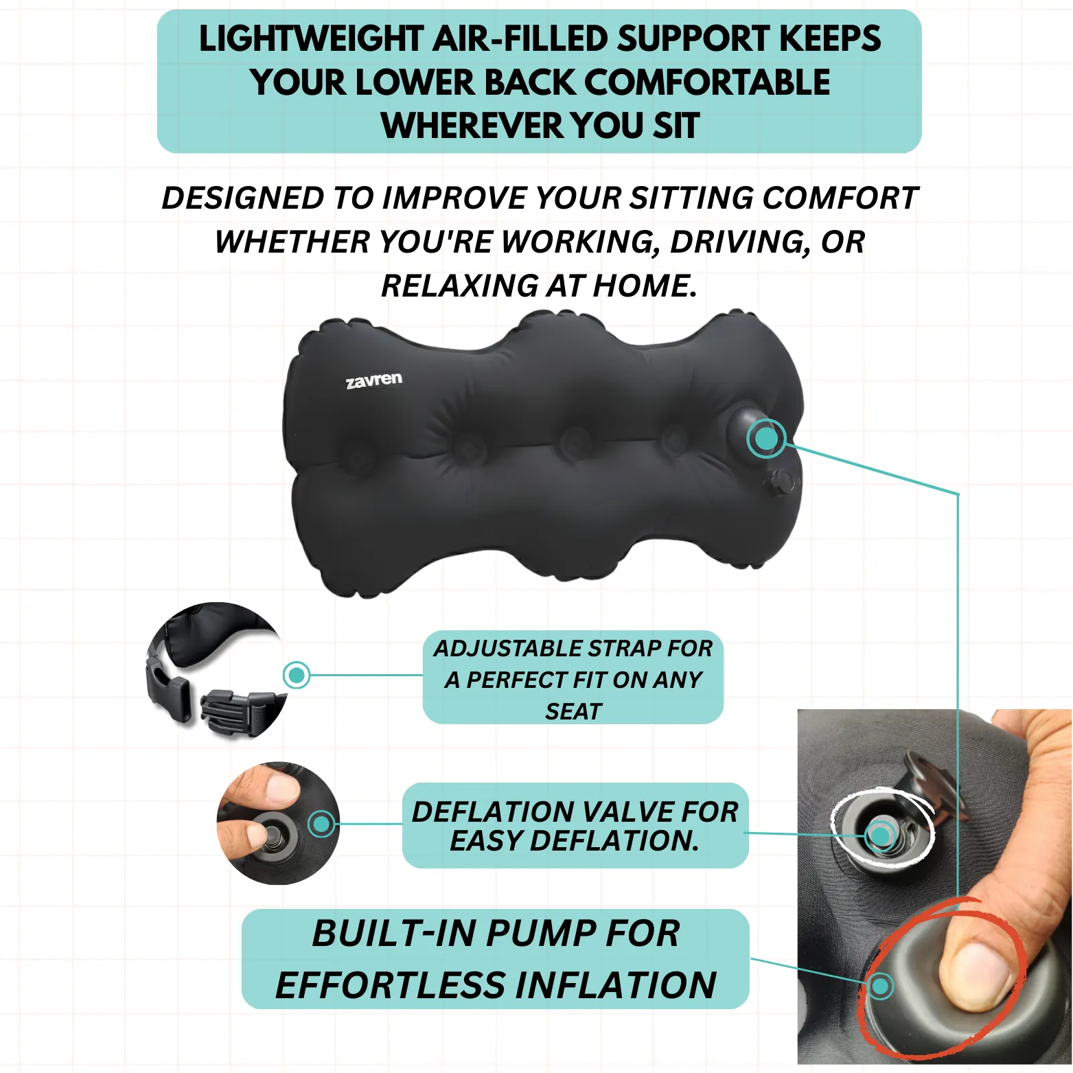 Experience ultimate comfort and support wherever you are, with our wide selection of portable wellness products. Our assortment includes inflatable neck pillows, seat cushions, and lumbar support pillows-each designed to provide relief and proper posture for busy lifestyles. Whether you’re working at a desk, traveling, or relaxing at home, our products make everyday sitting and resting more enjoyable. Browse our store to find innovative solutions tailored for ergonomic support and pressure relief. Each item combines durability, style, and practicality, ensuring you get the most comfortable experience possible. Designed for easy maintenance and versatile use, our catalog includes accessories for both adults and kids, making comfort accessible to everyone.